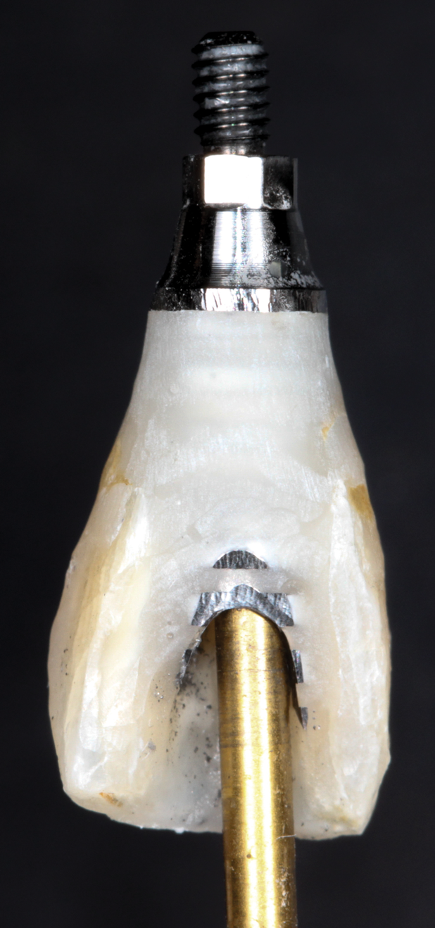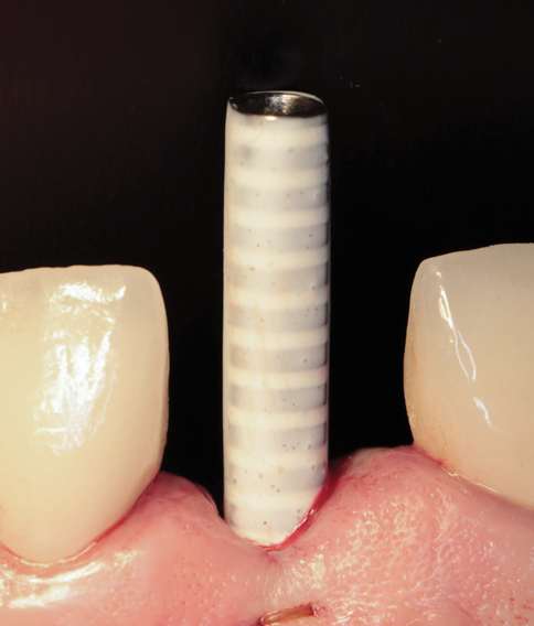 The body shape and abutment connection of the implant selected are extremely important when considering immediate provisionalization. To assist in achieving sufficient initial stability of the implant to permit provisionalization, the implant body shape recommended is a tapered design with aggressive, sharply pitched threads. The abutment connection should allow for ease of attachment and removal of the prosthesis using screw retention. An engaging temporary abutment is used to retain the provisional restoration.