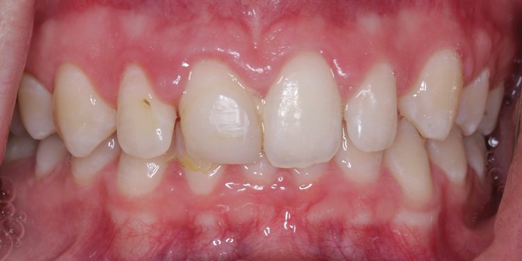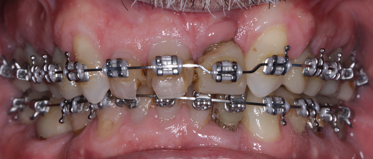 (11.) Retracted view of the patient after the initiation of orthodontic treatment. Upon completion of the orthodontic treatment, the patient will receive a full-mouth prosthetic rehabilitation with ceramic crowns. Tooth No. 9 was retained for implant site development but would eventually be extracted to place an implant-supported crown.