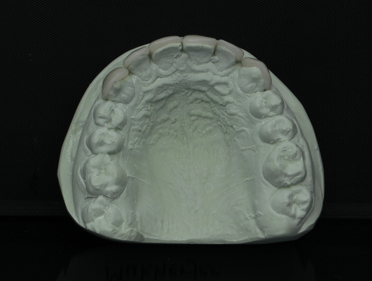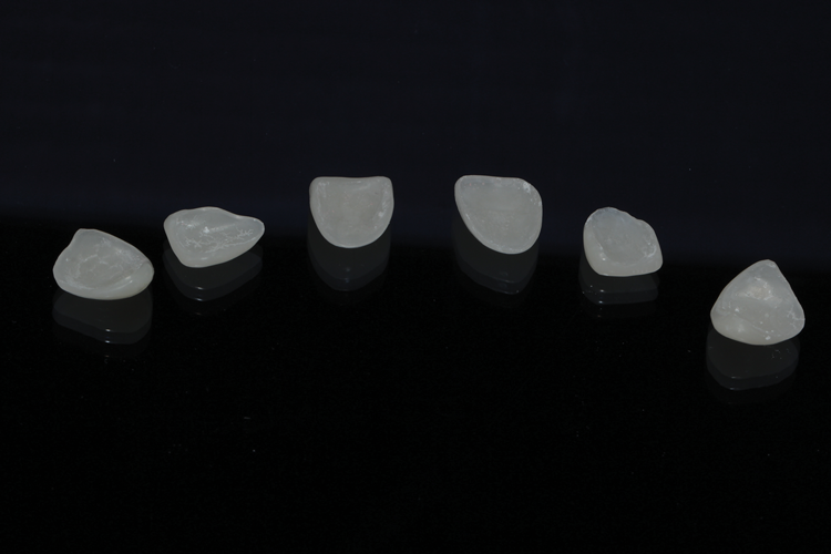 (4.) Facial, incisal, and intaglio views of the composite veneers that were designed and milled for teeth Nos. 6 through 11.