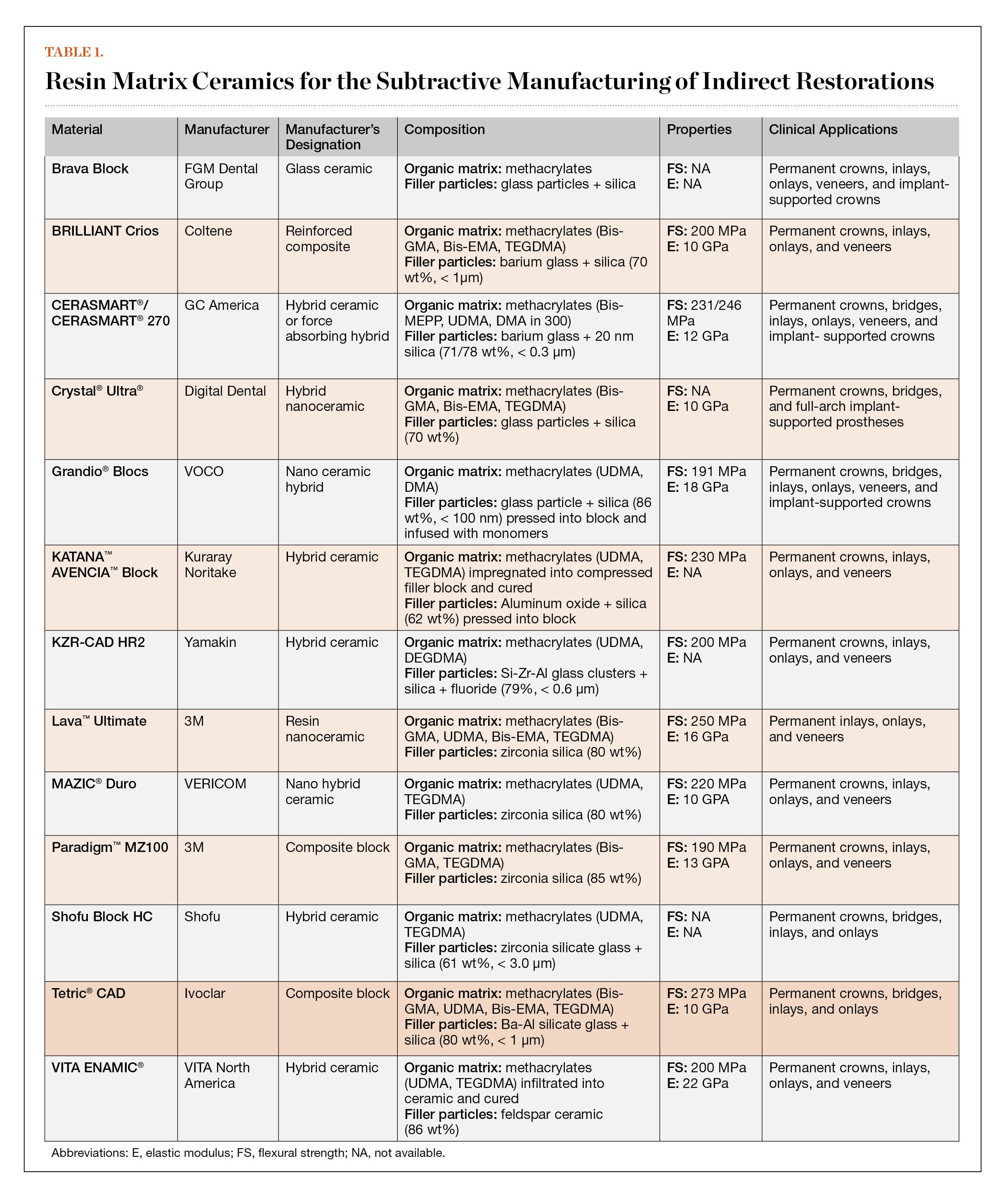The properties of these indirect composite materials are largely influenced by the composition, quantity, and particle size of their fillers. Generally, materials with filler particles that are smaller on the nanoscale produce the glossiest polished surfaces, and materials with larger percentages of filler content demonstrate greater mechanical properties. The type of monomer used in dispersed particle resin-based ceramics may also affect their properties because the matrix that supports the reinforcing fillers is a continuous polymer network. Table 1 provides manufacturer data regarding the clinical applications of some of the resin matrix ceramics available for milling indirect restorations. It should be noted that the manufacturer-reported values for properties such as flexural strength and elastic modulus are often higher than what is reported by independent research in the literature.Research has also indicated that the wear resistance of milled RMCs is typically lower when compared with that of milled ceramics.4