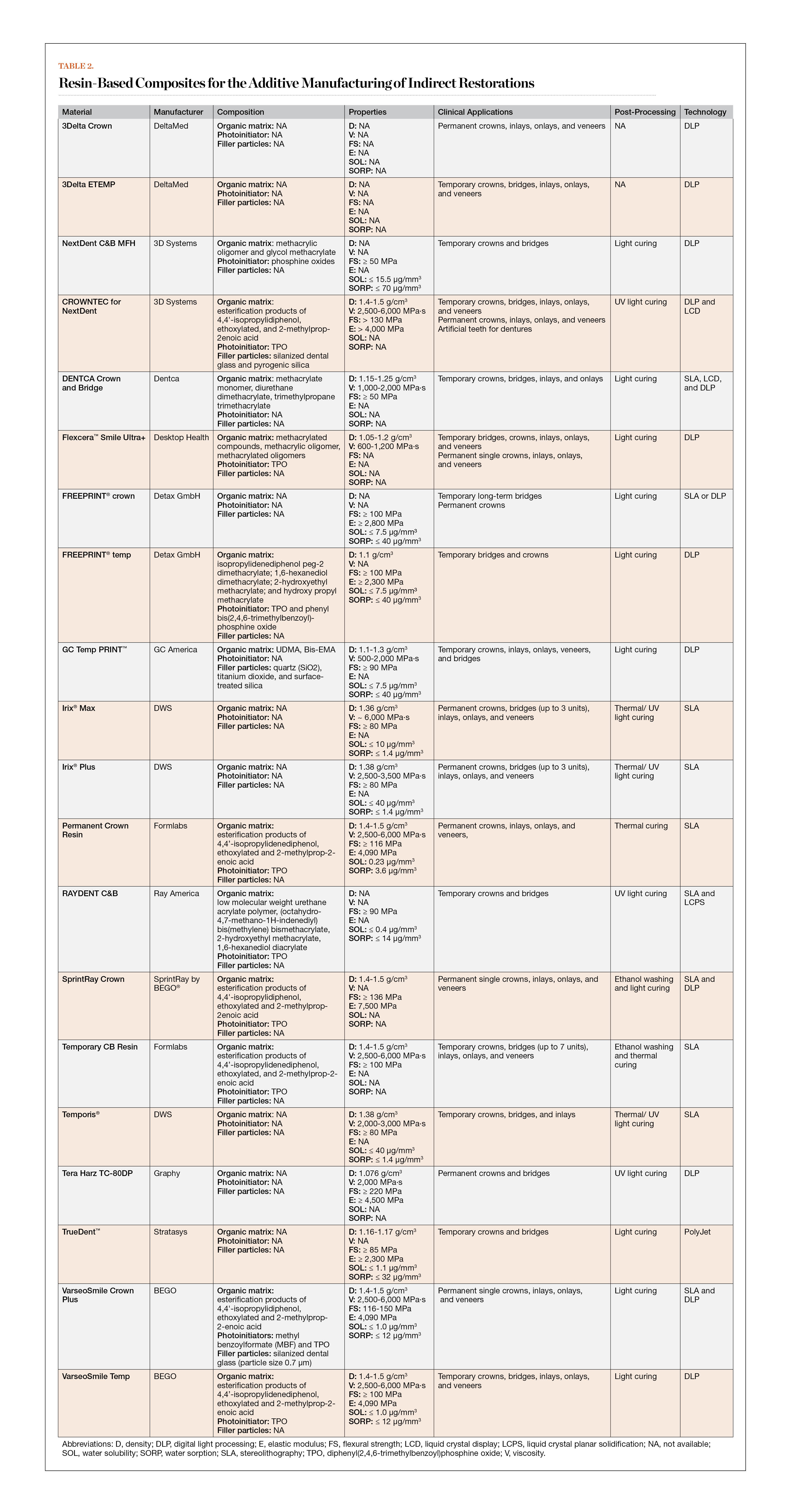 Advances in the development of polymer-based 3D printing dental materials have played a key role in accelerating the bench-to-chair process of additive manufacturing. The commercially available array of resin-based composites for 3D printed indirect restorations has been rapidly broadening, and most of these materials are compatible with digital light processing (DLP) or stereolithography (SLA) technologies. Although the exact formulations of these materials are proprietary, generally speaking, they are similar to those of conventional composites that are based on (meth)acrylate monomers, photoinitiators, and inorganic fillers. Table 2 provides manufacturer data regarding the clinical applications of some of the resin-based composites available for 3D printing indirect restorations.