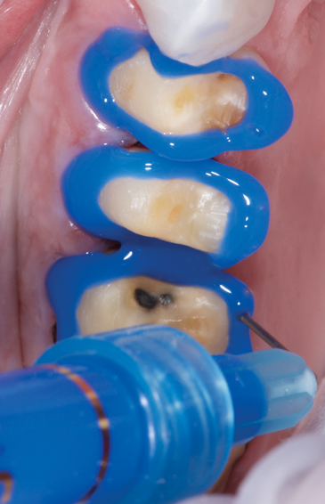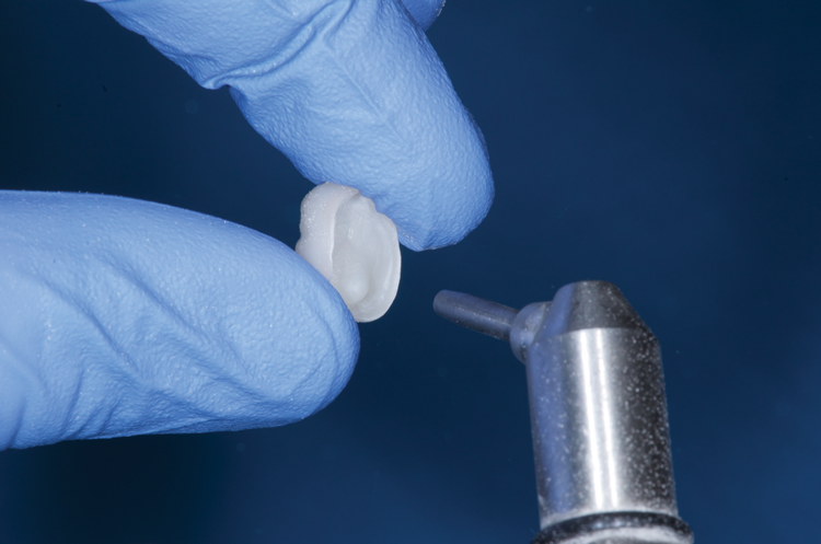 After a zirconia restoration is tried-in and cleaned, the intaglio surface should be airborne-particle abraded with alumina or silica-coated alumina particles (Figure 1). Some clinicians refer to this procedure as sandblasting or microetching. To air-abrade zirconia, a chairside microetcher using small particles ranging from 50 µm to 60 µm at a low pressure (ie, below 2 bar) is sufficient.7,9,11,12,27 The overall effect of pretreatment with alumina seems to be more important than the actual degree of surface roughening that it achieves, especially because of its ability to effectively decontaminate the bonding surfaces.27 As previously mentioned, the effects of air-particle abrasion on the flexural strength of zirconia have been discussed extensively, and most existing studies indicate that the use of particularly small particles actually provides a strengthening effect.28