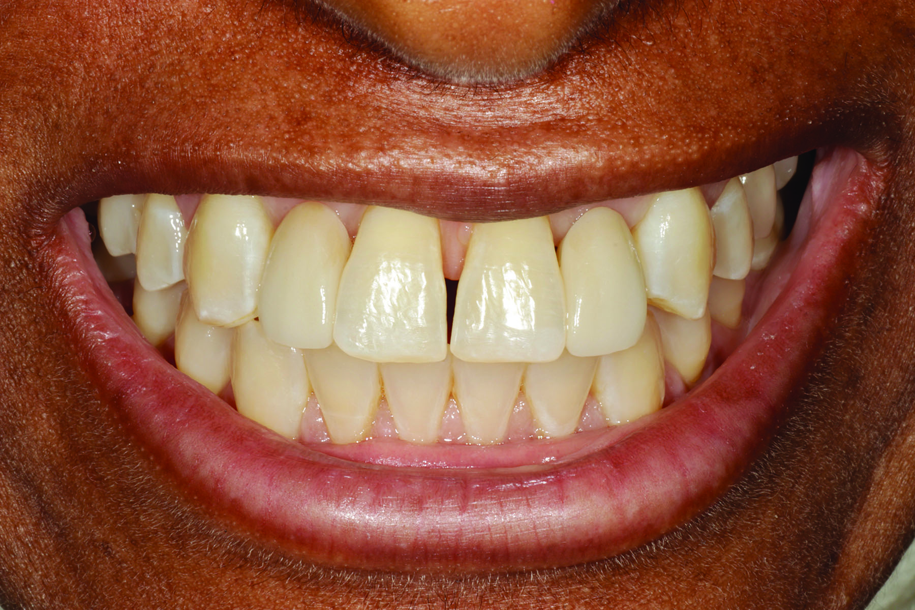 For indirect restorations, such as inlays, onlays, veneers, and crowns, with reduced wall height and/or excessive wall taper, the use of a dentin bonding agent and resin cement is ideal. Both older and newer glass ceramics have a well-documented track record of success with this approach, regardless of the preparation type selected. Ideally, any enamel involved is etched with phosphoric acid and a dentin bonding agent is used. For glass ceramics that are less than 1.0-mm thick, a light-cure only resin cement might be preferred to minimize the risk for color shift over time (Figure 1 through Figure 3). Meanwhile, ceramic restorations that are greater than 1.0-mm thick are better delivered with a dual-cure resin cement to ensure adequate polymerization of the cement. In either case, photopolymerization of the dentin bonding agent prior to placement of the restoration with resin cement produces much higher bond strengths. Practitioners using dentin bonding agents with low film thicknesses (ie, 5 to 25 microns) should be able to predictably perform this step at the time of delivery. Practitioners who choose to use dentin bonding agents with higher film thicknesses must either co-polymerize the dentin bonding agent with the resin cement, which can lead to lower bond strengths, or utilize a technique such as immediate dentin sealing.