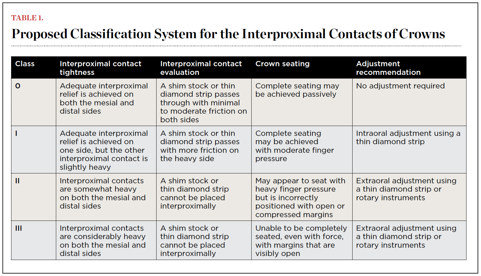 The classification system for the interproximal contact between crowns and their adjacent teeth that is presented here was developed by the authors based on the number and strength of the interproximal contacts and their effect on marginal adaptation. The descriptions of and recommendations for each class are made assuming that all parts of the crown, including the margin and intaglio and occlusal surfaces, are fabricated with high accuracy. The details of the clinical presentation may vary if fabrication errors are also a factor. The clinical recommendations for each of the four classes (ie, Classes 0, I, II, and III) are intended to help clinicians select effective strategies for interproximal contact adjustments (Table 1). A class for open interproximal contacts is not included in this classification system.