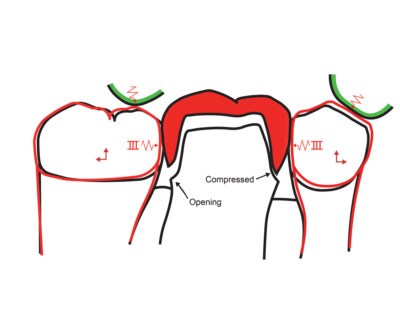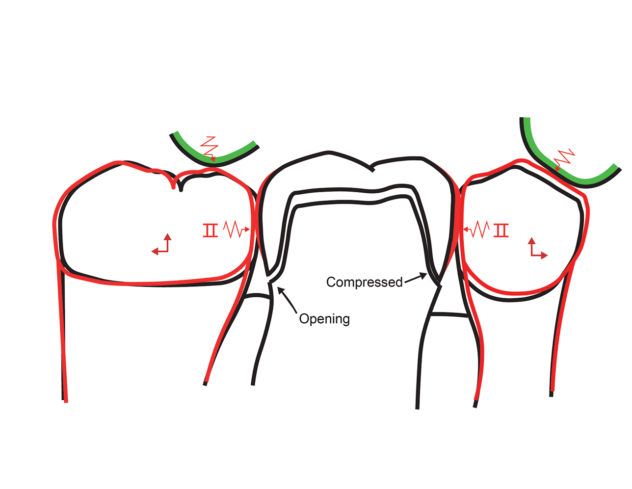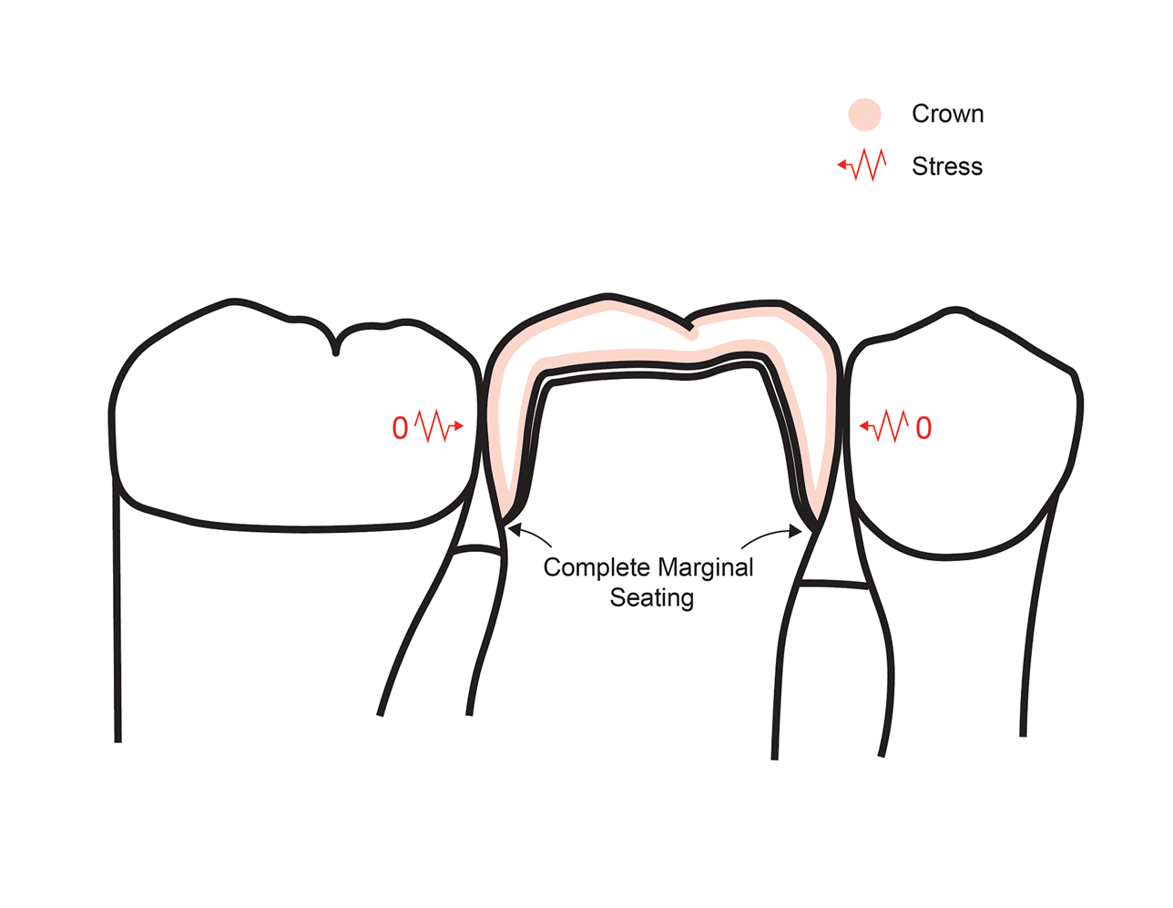 In Class II, the interproximal contacts on both sides are somewhat heavy (Figure 3). The excessive tightness of the interproximal contacts does not permit a shim stock sheet or a thin diamond strip to be passed through the mesial or distal interproximal spaces. In Class II, a crown may visually appear to completely seat when higher finger pressure is exerted; however, at the microscopic level, the forced seating results in inaccurate positioning of the crown. Furthermore, vertical or horizontal displacement of the adjacent teeth may occur to compensate for the excessive and uneven lateral pressure from one or both sides. This leads to compression of the crown margin on the side with the heavier interproximal contact, resulting in incomplete seating of the crown margin on the other side (Figure 4). Unless interproximal relief is achieved to permit complete seating, it is premature to evaluate either marginal adaptation or occlusion. Extraoral adjustment of the crown may be necessary.