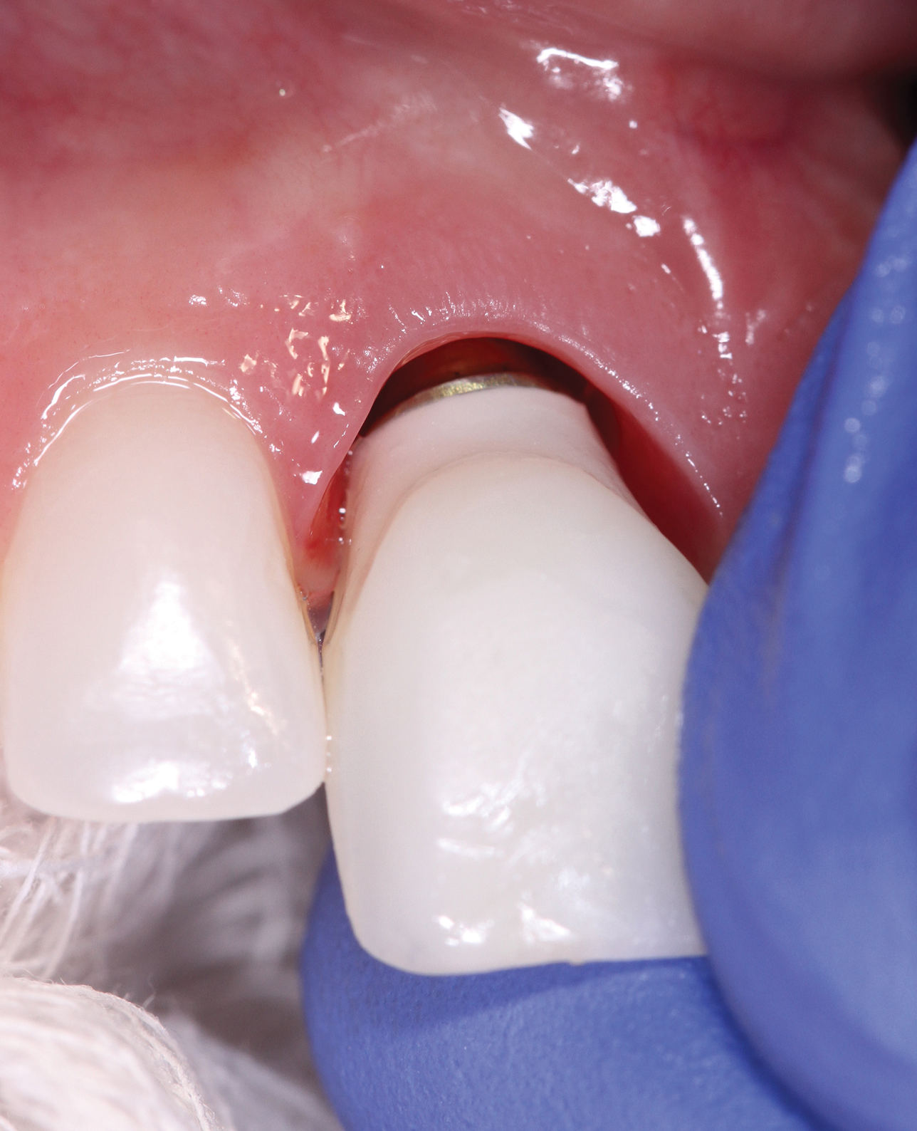 Because the prosthetic components of screw-retained implant crowns connect directly to the implant, the delivery process may be more challenging. As a screw-retained implant crown is tried in and out to adjust the occlusion and interproximal contacts, the soft tissue may collapse or prevent complete seating of the implant crown. This can make the delivery process more time-intensive and frustrating for the clinician. Typically, the more subgingivally an implant is located, the more challenging the delivery process is. One means by which the delivery process can be made easier is through the use of a custom healing abutment or, at least, a large-diameter stock healing abutment. This can help to facilitate tissue retraction at the time of delivery.