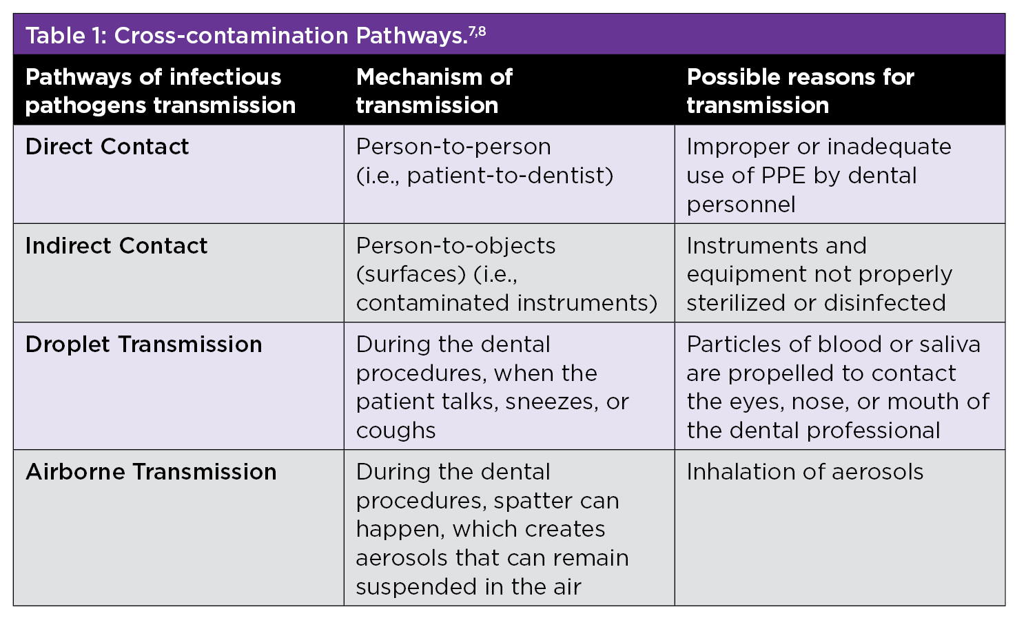 To minimize the transmission of infectious pathogens for both dental personnel and patients, in 1996 the Centers for Disease Control (CDC) introduced Standard Precautions. Standard Precautions are the minimum infection prevention practices, or series of steps applicable to all patients, regardless of their suspected or confirmed infection status.6 All items that came into direct contact with the patient should be treated as potentially contaminated, and the dental personnel must follow strict infection control protocols.6,7 There are several distinct pathways for cross-contamination, which should be monitored to reduce the risks of infections as described below in Table 1.7,8