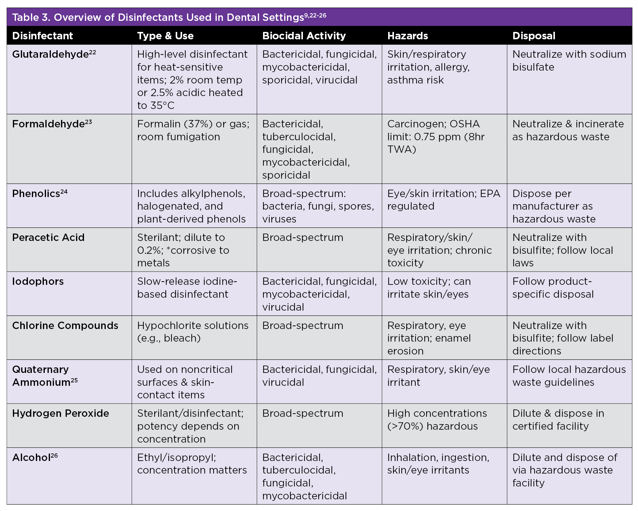 Disinfection is defined as the destruction or suppression of most infectious pathogens during their active stage when they can rapidly spread.9 Because this decontamination method involves the inactivation of the viruses, unlike sterilization, it does not kill the infectious pathogens and is more difficult to monitor and verify its efficiency. The chemical disinfectants used in dental care settings must be tuberculocidal, because tuberculosis is an airborne disease that spreads easily if not contained.7,9 According to the Environmental Protection Agency (EPA), disinfectants are classified by their level of disinfection, which depends on their antimicrobial activity against infectious pathogens and the required contact time with surfaces or items:20