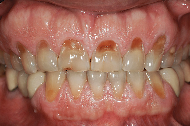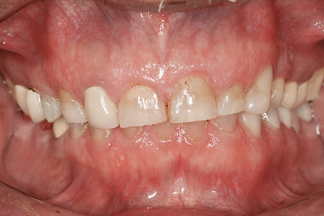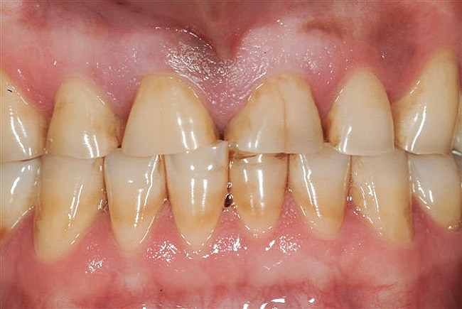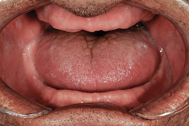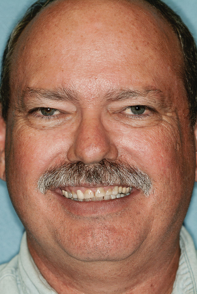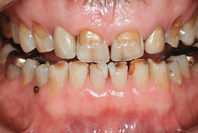 The majority of patients in the mature group will have at least mild apnea. Medical issues related to overall health may be linked to OSA. Bruxism may be present but will be limited in its ability to clear the airway and reduce GERD. Patients may need to address tooth wear issues that have been compounded through years of neglect (Figure 21 and Figure 22). Comprehensive evaluation for signs and symptoms of OSA and referral for polysomnographic study is recommended. Patients with dentures should be encouraged to wear their dentures at night if sleep disruption is present (Figure 23 and Figure 24).