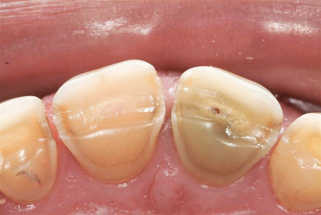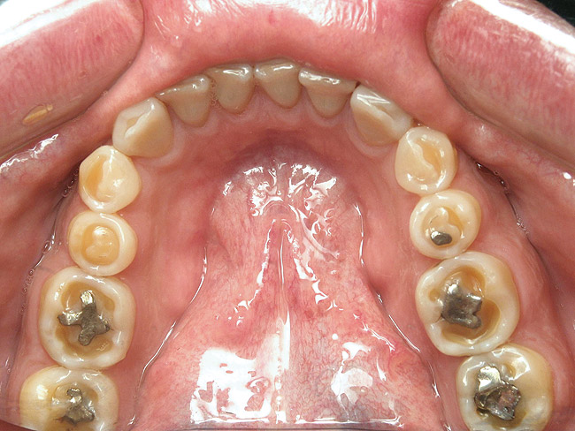 Some of the acid content of the stomach may reach the oral cavity. This is an extremely destructive acid with a pH of 1 to 2. In comparison, dietary acids are greater than pH 3. The most common site for damage is the palatal surface of the maxillary molars (Figure 5 and Figure 6). Reflux symptoms present mostly in a supine position. The dorsum of the tongue pushes the acid to the maxillary molar palatal surface when swallowing to buffer the acid.42 While the palatal surface is the most common site of destruction, the pattern of damage will be dictated by the sleep position of the patient during the episodes. Tongue activity associated with airway patency coupled with regurgitation may also create wear on the lingual surfaces of teeth resembling bulimia but are not limited to the maxillary anteriors (Figure 7). GERD patients have a significantly higher risk of xerostomia and oral burning sensation.43 This lack of lubrication paired with acid-roughened surfaces increase the risk of frictional wear associated with sleep bruxism.