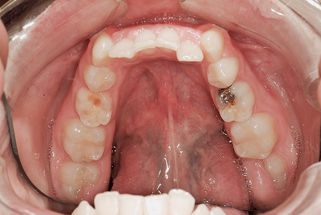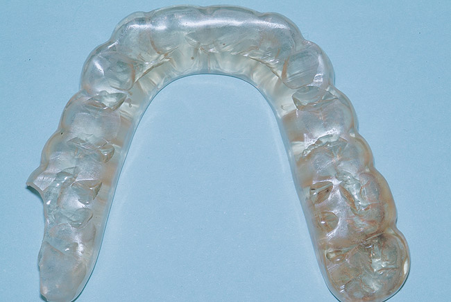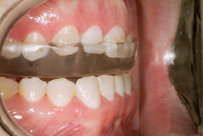Pathologic tooth wear or significant relapse of orthodontic correction is usually addressed by fabrication of an occlusal orthosis. Continued grinding on the appliance is a hallmark for the bruxism triad. Self-reports of high stress may be due to repeated sleep disturbance and should not be disregarded. Evidence of GERD may be present on the teeth or maxillary palatal tissue. Bruxism may be acting as a protective reflex for the airway (Figure 14). There is a statistically significant association between childhood wear of the deciduous mandibular molars and canine teeth and the degree of whole-mouth wear observed 20 years later56 (Figure 15). For sleep bruxers with episodic sleep disturbances and reflux symptoms, this author has been using an anterior repositioning splint with success. The appliance is fabricated at < 40% of the patient’s maximum protrusion, minimizing the occlusal risk associated with advancement appliances (Figure 16 and Figure 17). The maxillary orthosis directs the patient’s closure into a protruded posture that opens the airway without being as bulky and restrictive as most MAAs.