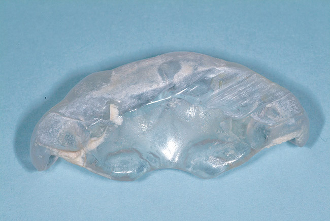 One important note is that traditional occlusal stabilizing splints may have a deleterious effect on SB-OSA patients. A prospective study of 10 mild to moderate OSA patients was conducted with multiple nights recorded with and without a stabilizing splint. Results indicated that six of the 10 subjects had a significant increase in their AHI with splint therapy.46 Further, OSA patients with complete dentures have significantly improved airways when sleeping with their dentures than without them.47 Both studies highlight that OSA patients have an improved airway when the mandible is placed and held in a protruded position. Efforts which prevent that ability may worsen the airway and increase sleep bruxism. This could account for the severity of wear found on some occlusal splints. The author has noted that patients with airway and GERD issues have notably more wear on their orthosis regardless of design (Figure 10 and 11).
