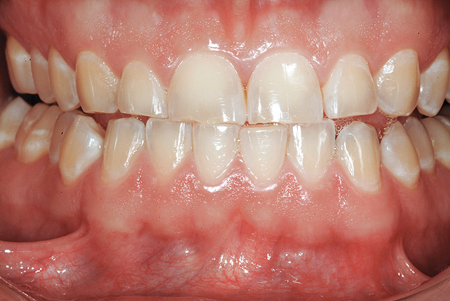 Dentists commonly tell parents that most children “grow out of bruxism” when they reach puberty. More accurately, many children grow enough to overcome the impact of the adenoids and tonsils, or orthodontic intervention expands the palate enough to create an adequate airway. Any signs of pathologic wear due to attrition or erosion at this stage should elicit questions about sleep disturbances, sleep bruxing, and reflux symptoms (Figure 13).