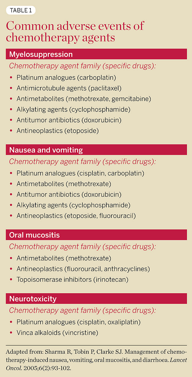 Many patients will have chemotherapy (CT) to manage their cancer. Oral complications will differ by the type of chemotherapy agent, and the type and severity of these complications can vary from patient to patient.2,3 Chemotherapy has become much more sophisticated throughout the years; however, the main goal of the treatment is to kill cancer cells. As research has improved, the drugs used in CT have changed and target the specific cancer cells, such as with antibodies that are designed to attack the individual’s type of cancer cells (this is sometimes referred to a “targeted” or “directed” chemotherapy).4 Unfortunately, many patients will still receive CT agents that target both the rapidly dividing cells of the tumor and normal cells in the mucosa, bone marrow, and immune system (sometimes called cytotoxic chemotherapy). Adverse events of common cytotoxic CT agents include myelosuppression (thrombocytopenia [an abnormally low platelet count]/bleeding and neutropenia [an abnormally low neutrophil count]/oral infections), nausea and vomiting, oral mucositis, and neurotoxicity (Table 1).3–––– Dysgeusia (distorted taste) is also reported as a complication that may be related to the neurotoxicity, the inability to clean one’s mouth because of the pain of mucositis, infections such as candidosis, or the CT agent itself as it perfuses into oral fluids.5