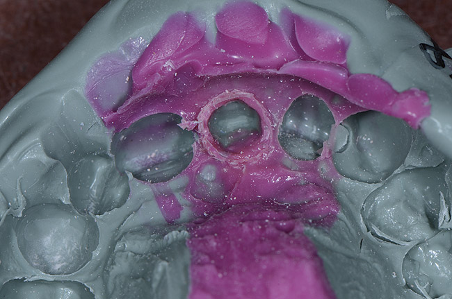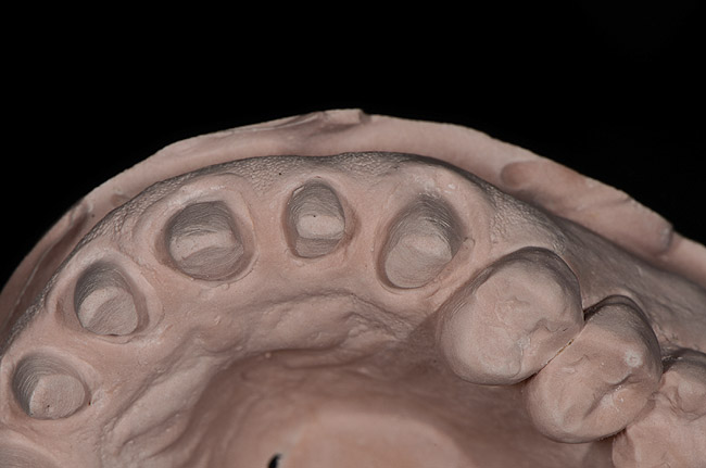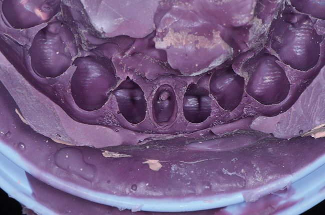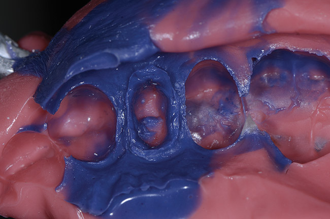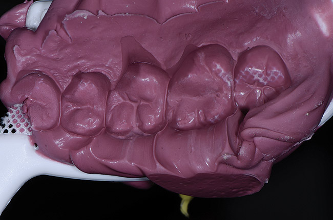 It is important to remember that the purpose of a master impression is to create a master model on which qualified laboratory technicians will fabricate restorations to serve the esthetic, functional, and biologic requirements of the patient. With that in mind, it is critical that upon removal of the impression, it be closely evaluated. The final impression should capture all the surfaces of all the teeth and extend to the mucobuccal fold (Figure 1). If a maxillary impression is made, a good representation of the palate is also important. The occlusal surfaces of all the teeth should be captured in detail (Figure 2). The impression should be free of pulls, voids, and air bubbles (Figure 3). The preparations should be clean, crisp, and free of contamination; in addition, the impression material should have flowed 0.5 mm past the margin circumferentially around the tooth (Figure 4 through Figure 7).