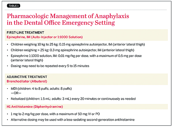 If the allergy is severe, the patient has lost, or soon will lose, consciousness. The dentist should place the patient in a supine position, open the airway, and evaluate breathing. Often, breathing is spontaneous and adequate. If the patient is not breathing, the dental professional must administer positive pressure oxygen via a bag–valve–mask device. If the patient has lost consciousness, his or her cerebral blood pressure is too low. Another dental staff also must contact EMS as the patient requires additional treatment in the hospital’s emergency department. The appropriate pharmacologic management for anaphylaxis in an outpatient setting is outlined in Table 1.