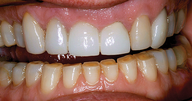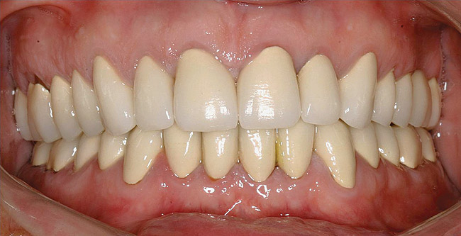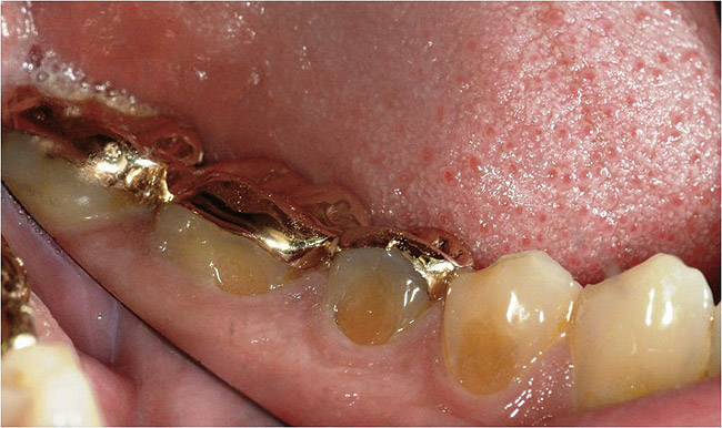 If the centric relation and centric occlusion in the presence of tooth surface loss is the same, or the dento-alveolar compensation has occurred, the teeth should be restored.54 The restorations can include Class V or palatal restorations, or reproduction of the cusps (Figure 9). Also, restorations can include covering the affected tooth surfaces with resin-based composites, using a sandwich technique, or placement of metallic, porcelain-fused-to-metal, or ceramic crowns (Figure 10, Figure 11, Figure 12, Figure 13, Figure 14, Figure 15 and Figure 16).