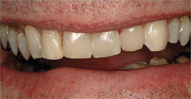 The mechanical forces affecting attrition include chewing, deglutition, and parafunctional habits. If these forces go unchecked, the enamel will develop wear facets that are usually flat and well circumscribed in both opposing arches (Figure 7).